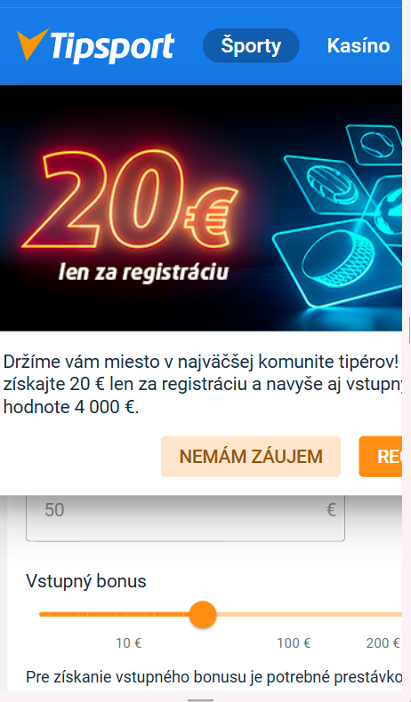 | Tipsport | 20€ na prvú stávku | Kompletná registrácia + KYC | Áno (stávky) |