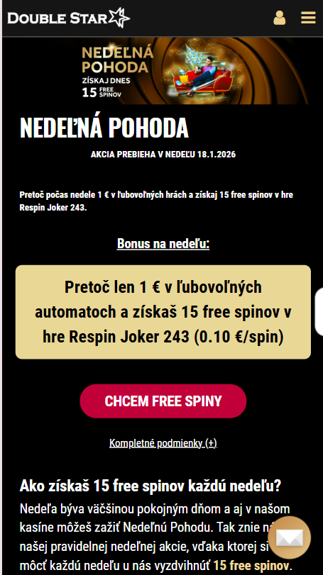 Free spiny sú dostupné v rámci akcie Nedeľná pohoda, ktorá prebieha každú nedeľu. Pre získanie bonusu je potrebné počas nedele staviť v automatoch v celkovej hodnote minimálne 1 €. Hráč získa 15 free spinov do hry Respin Joker 243 v hodnote 0,10 € za otočku. Free spiny sú platné 48 hodín od pripísania. Stávky v stolových hrách, Crash Games a hre Plinko sa do obratu nezapočítavajú.