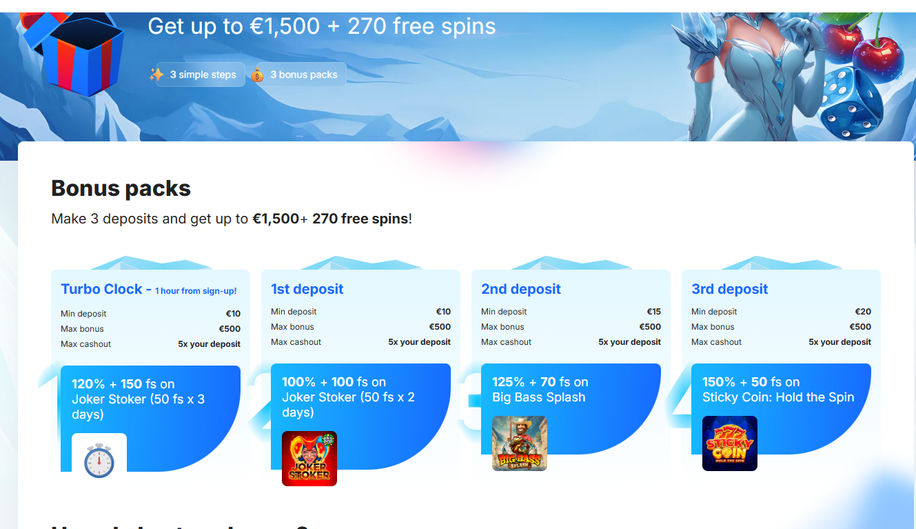 V Ice Casino patria free spiny medzi hlavné súčasti uvítacieho bonusu pre nových hráčov. V rámci bonusových balíčkov za prvé tri vklady môžete získať bonus až do výšky 1 500 € a spolu 270 voľných zatočení, ktoré vám umožnia vyskúšať populárne výherné automaty bez okamžitého rizika vlastných prostriedkov.