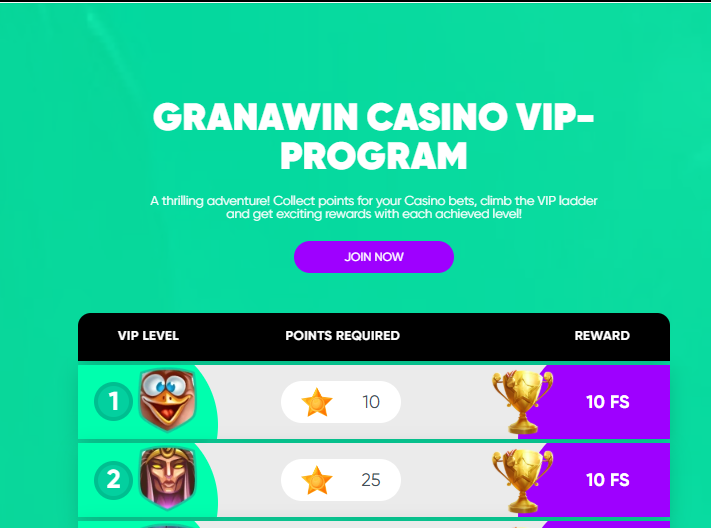 VIP program v kasíne Granawin je vernostný systém určený pre aktívnych hráčov automatov. Funguje na princípe zbierania bodov (CP – Comp Points) za stávky v slotoch, vďaka ktorým postupujete po VIP úrovniach a získavate odmeny vo forme free spinov alebo hotovostných bonusov. Do programu sa zapojíte automaticky po prvom vklade, bez nutnosti osobitnej registrácie.