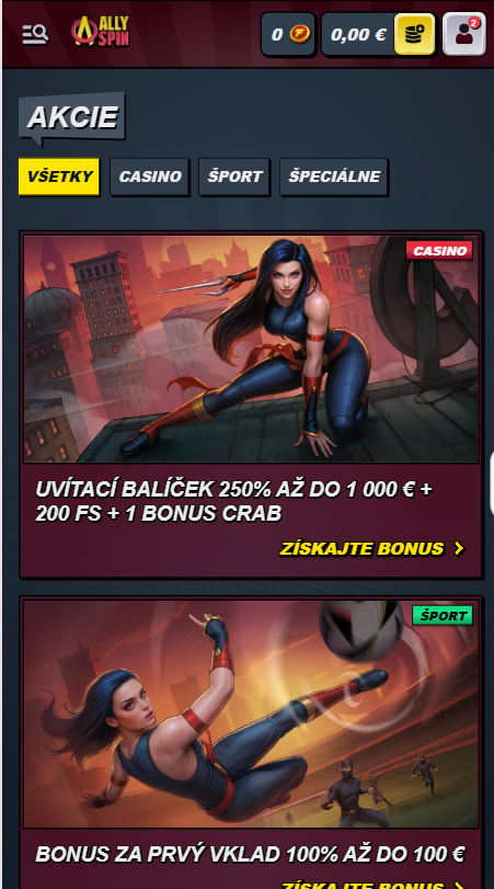 AllySpin je moderné online kasíno, ktoré odštartovalo v roku 2024 pod spoločnosťou Fortuna Games NV. Platforma funguje na základe licencie Curaçao Gaming Control Commission, čo je bežný štandard pre medzinárodné kasína s hráčmi z rôznych krajín. AllySpin je dostupné vo viacerých jazykoch vrátane slovenčiny a cieli najmä na hráčov, ktorí hľadajú veľký výber hier, rýchle platby a podporu kryptomien. Kasíno kombinuje klasické online hry, rozsiahle live kasíno a sekciu pre športové stávky. Celkovo ponúka AllySpin viac ako 10 000 hier, z toho približne 700 live hier od známych poskytovateľov. Hrať sa dá priamo v prehliadači bez sťahovania, na mobile aj cez aplikáciu. Noví hráči môžu využiť atraktívny uvítací bonus, ktorý zahŕňa percentuálny bonus k vkladu, free spiny a extra bonusový prvok.