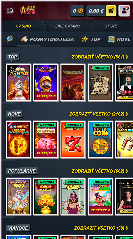 Herné portfólio AllySpin zahŕňa približne 10 000 hier, takže si tu nájde niečo každý typ hráča. Základ ponuky tvoria moderné video automaty s rôznymi mechanikami – od klasických slotov a Megaways až po Bonus Buy a rýchle hry. Silnou stránkou platformy je aj live kasíno, kde je k dispozícii veľké množstvo stolov s živými krupiérmi, vrátane rulety, blackjacku, baccaratu a live show hier. Vďaka prehľadnému rozdeleniu do kategórií si jednoducho vyberieš populárne tituly, novinky alebo exkluzívne hry, či už hráš na počítači alebo mobile.