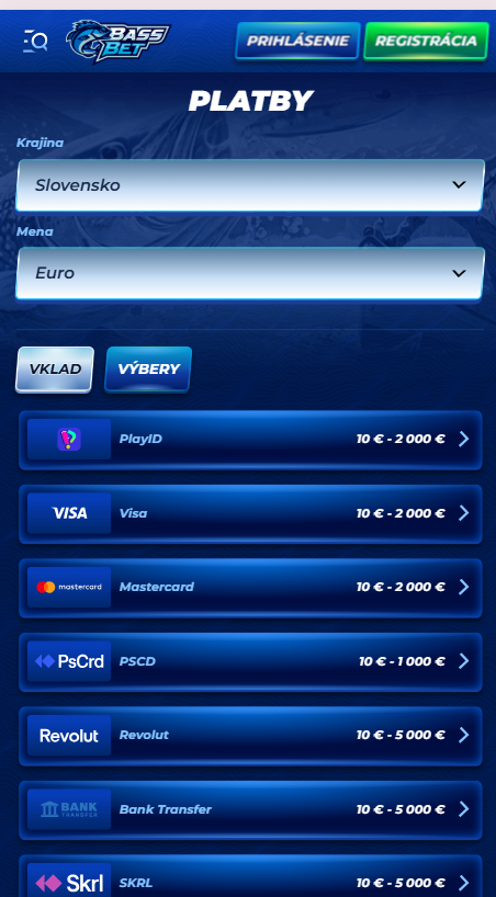 Minimálny vklad vo väčšine prípadov začína od 10€, hoci pri niektorých metódach sa môže mierne líšiť. Maximálne limity závisia od konkrétnej platobnej služby. Na výbery Bassbet používa rovnaké populárne metódy ako pri vkladoch, vrátane kariet, e-peňaženiek a kryptomien. V tabuľke nižšie nájdeš prehľad hlavných platobných metód a ich limitov podľa údajov na stránke kasína.