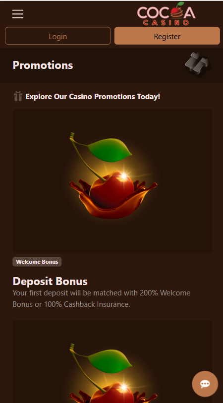 V Cocoa Casinu si noví hráči môžu vybrať medzi dvoma uvítacími ponukami. Pri prvom vklade máš k dispozícii Cocoa Casino bonus vo forme 200% bonusu za vklad alebo 100% cashback insurance, čo je vlastne poistenie – ak prehráš, kasíno ti vráti celý vklad späť. Klasický bonus funguje jednoducho: kasíno zdvojnásobí sumu tvojho vkladu. Čím viac vložíš, tým vyšší bonus získaš. Ak si vyberieš cashback, po vyčerpaní zostatku stačí kontaktovať podporu a peniaze ti pripíšu späť. Presné podmienky nájdeš v pravidlách kasína.