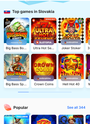 Ice Casino pravidelne zobrazuje pri jednotlivých hrách označenie „Top game in Slovakia“. V čase písania recenzie sa na prvej priečke držal Big Bass Bonanza, čo potvrdzuje, že slovenskí hráči preferujú kombináciu jednoduchej mechaniky a potenciálu na vyššie výhry v bonusovom free spins kole.