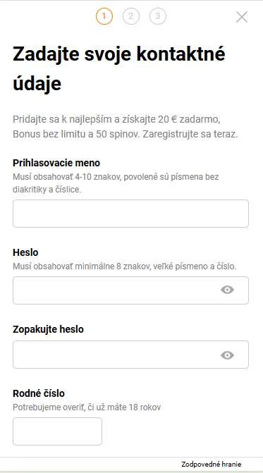 Vyplňte formulár pravdivými údajmi: Zvoľte si prihlasovacie meno a silné heslo, vyplňte požadované osobné údaje (meno, priezvisko, rodné číslo atď.) a kontakt (e-mail, telefón). Následne potvrďte svoje telefónne číslo zadaním kódu z SMS a rovnako aj e-mail kliknutím na overovací odkaz.