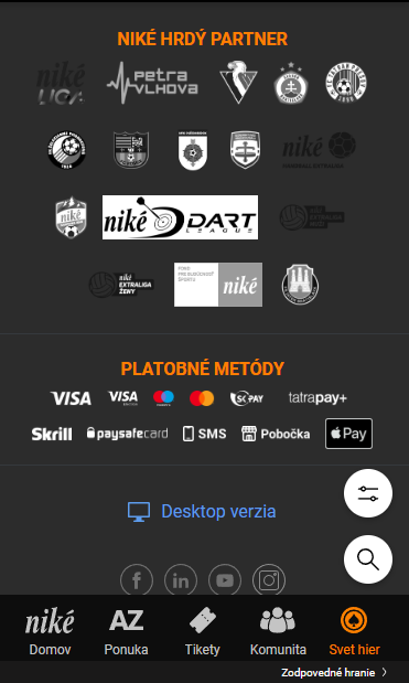 | Zákaznícka podpora | Telefón (infolinka 02/60 269 999, 24/7), online formulár (Nike.sk) – live chat len ako hráčska diskusia |