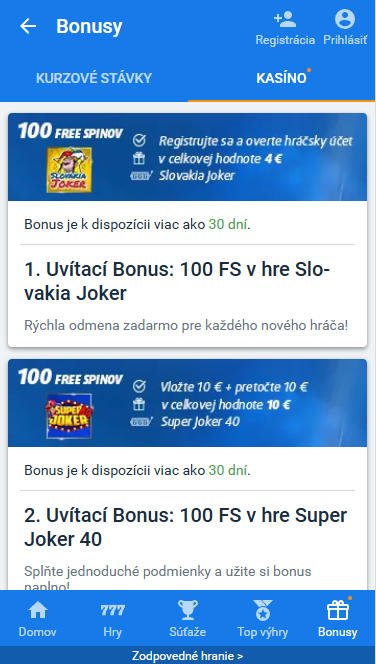 | Bonus bez vkladu | 20 € na tipovanie + 100 free spinov Slovakia Joker za registráciu a overenie účtu |