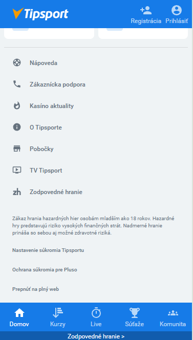| Mobilné hranie | Web + Tipsport aplikácia pre Android, iOS a AppGallery |