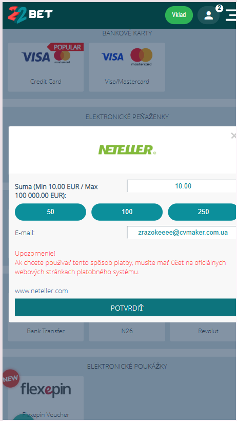 - V sekcii Vklad vyber ako platobnú možnosť „Neteller“.