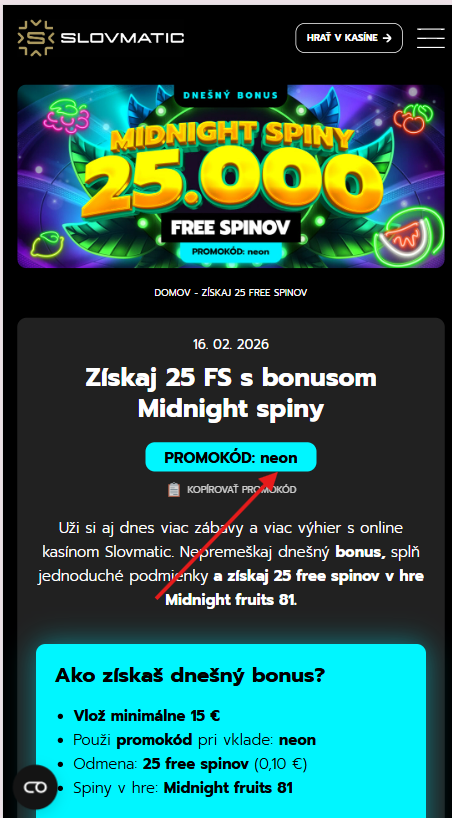 Akcia Získaj 25 FS s bonusom Midnight spiny ti prinesie 25 free spinov v hre Midnight fruits 81. Stačí vložiť aspoň 15€ a pri vklade zadať promokód neon. Pri online vklade (karta, aplikácia, bankový prevod) zadáš kód priamo do poľa „promokód“. Ak použiješ SMS vklad alebo klasický bankový prevod, po platbe kontaktuj zákaznícku podporu, ktorá bonus aktivuje. Pri vklade na pobočke nahlás promokód obsluhe. Bonus sa pripíše do 1 minúty, najneskôr do 24 hodín po splnení podmienok. Získať ho môžeš raz denne. Free spiny platia 24 hodín po pripísaní. Výhra z free spinov sa pripisuje na bonusové konto v Slovmatic.